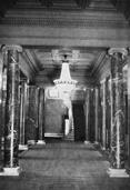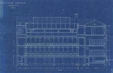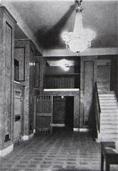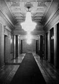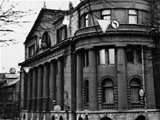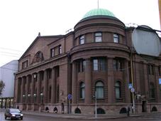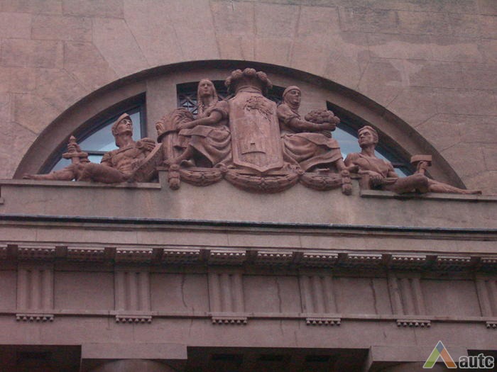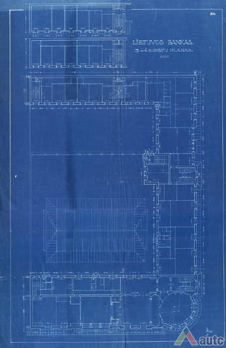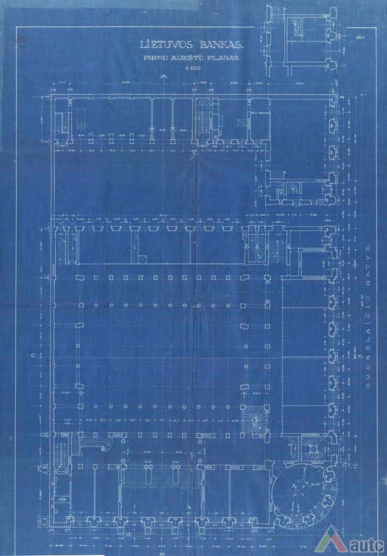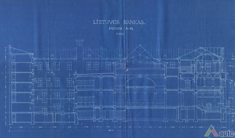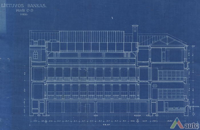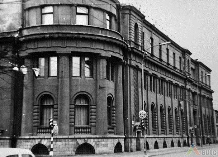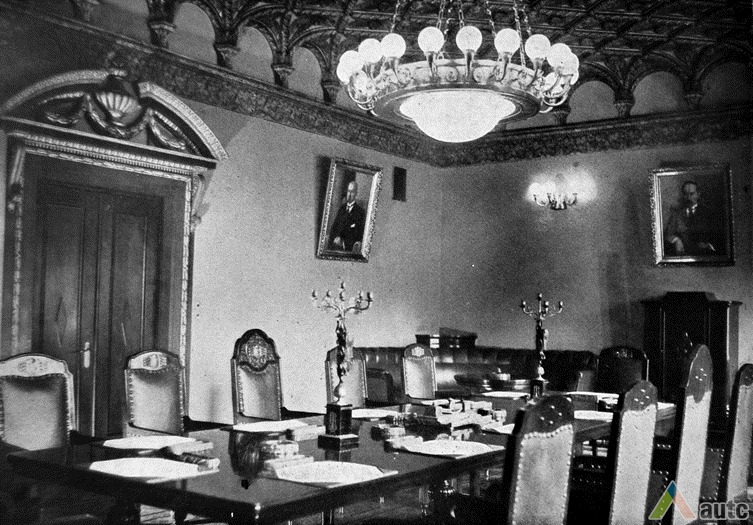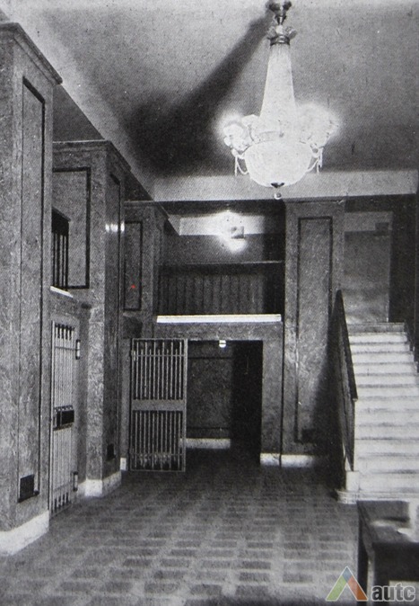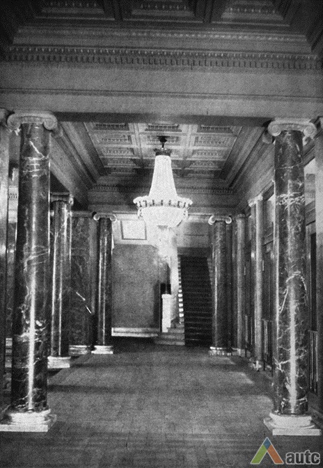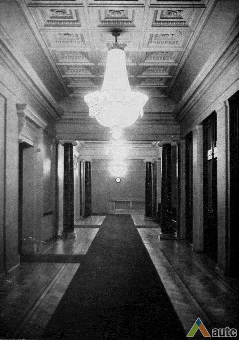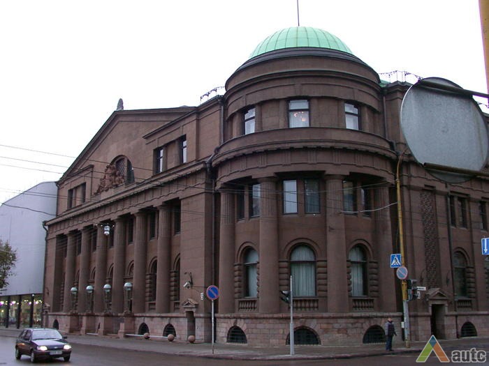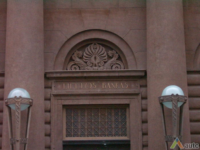An international tender for bank office was announced in 1924. The first grant was awarded to an architect from Paris (name unknown), yet his design was very complex and expensive. Therefore, the design was delegated to the only Lithuanian professor of architecture at that time, the chairman of the jury M. Songaila. Technical maintenance of the construction was carried out by F. Vizbaras. The construction was completed in 1928. The corner section of the third floor facing Maironis Street included the apartment of Prime Minister A. Voldemaras with a library, an office room and official reception facilities; meanwhile, on the side facing K. Donelaitis Street — apartments of bank managers. The roof platform, enclosing the huge triangular-shaped skylight of the operation floor, had a “garden”. Down in the basement, under the operation floor there were vaults with special control hallways and security cameras (the security system was installed by an English firm). The palace had mechanical heating, moistening, and electric elevators. The courtyard side was designed for employee apartments, whereas the first floor had garages and the basement — utility facilities. Following WWII, the building hosted Kaunas Division of the State Bank. Now it has been returned to the Bank of Lithuania. Luxurious interiors of the bank used natural and artificial marble, granite, plastic and painted decor (artists P. Kalpokas, V. Didžiokas, O. Dubneckiene-Kalpokienė, J. Janulis), furniture of various styles, with the most valuable ones being luxurious lamps and chandeliers (art monuments of local significance). Geometric floor patterns of the lobby and the operation hall were laid out of greyish clay tiles, elsewhere the floors were out of parquet. The side staircase had a decorated stained glass (by artist S. Ušinskas) which did not survive. Lobby walls were finished by natural and artificial black, yellowish and brownish marble (artificial marble was produced by J. Dubovskis), black marble ionic columns separated grey staircase out of Swedish granite, ceiling caissons were decorated with rosettes (the same decor appeared in cloakroom ceiling).
