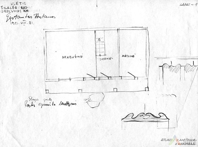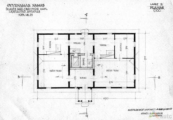 Name aštuonios patalpos, planas būdingas Žemaitijai. Į vidų patenkama per prieangį. Pirmoji patalpa – prieangis (čia vadinamas „butuks“), iš jo patenkama į abu namo galus. Viename namo gale yra geroji troba ir „alkierius“ su „kuknia“, kitame – mažoji troba ir kuknia. Per vidurį namo išmūrytas tradicinis žemaitiškas kaminas – virenė, už jos – ūkinė priemenė („sienuks“) su išėjimu į lauką. 1951 m. kaminas kaip virenė jau nebuvo naudojamas, naudota duonkepė krosnis. Kamine, „kuknioje“ prie mažosios trobos ir „sienuke“ tuo metu buvo plūkto molio asla, kitose patalpose – lentų grindys.