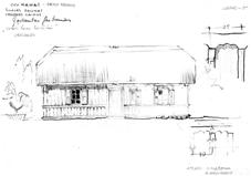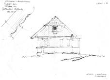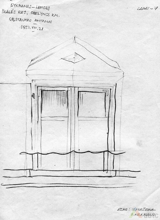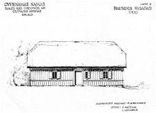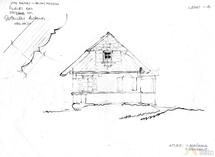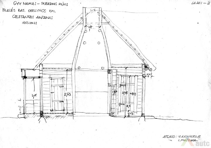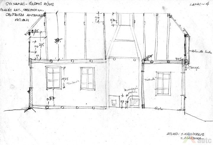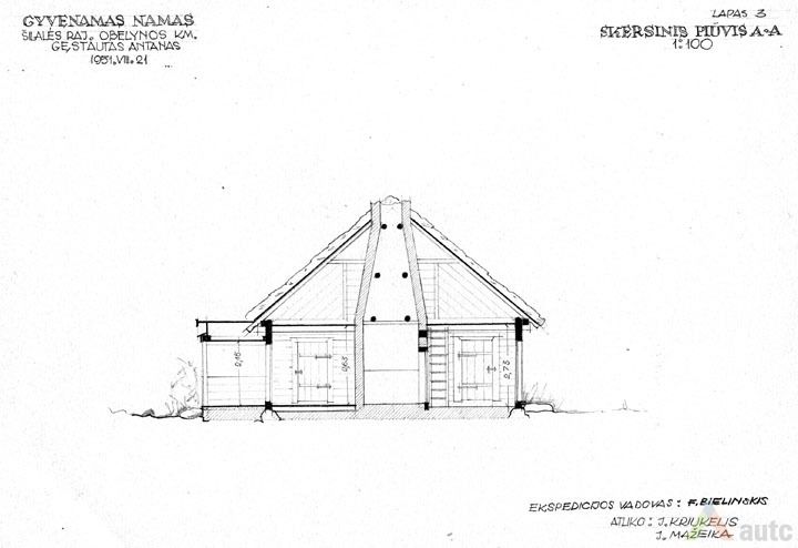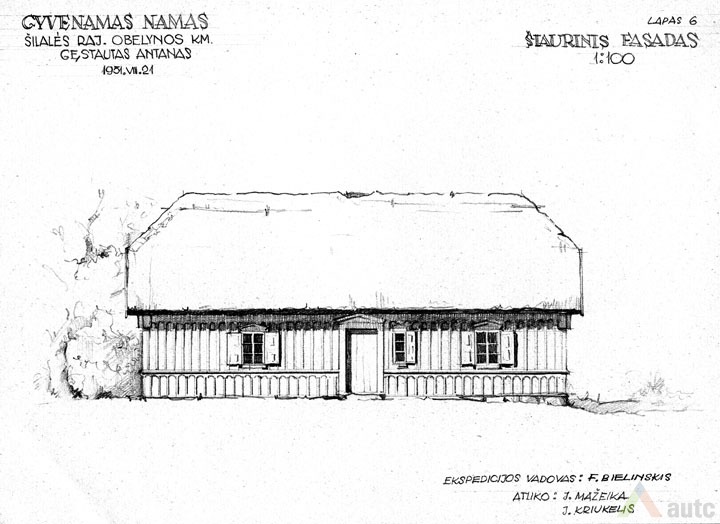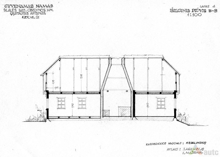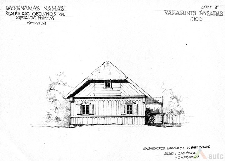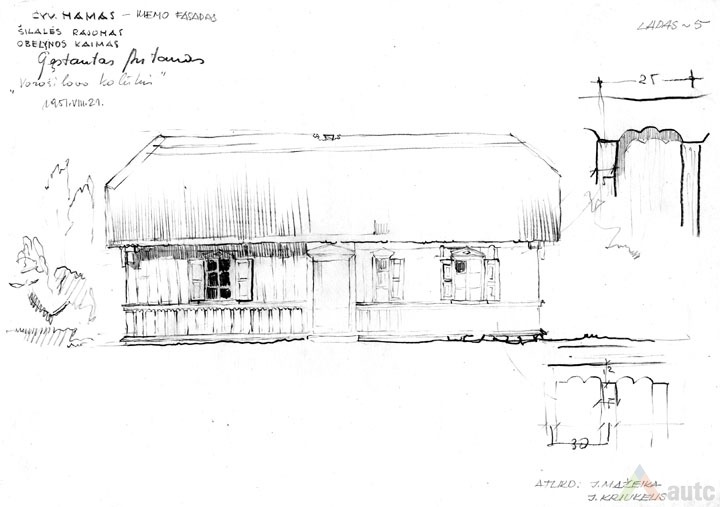 Gyvenamasis namas (troba) statytas apie 1900 m. Namas suręstas ant akmeninių pamatų, sienos rąstų, vertikaliai apkaltos lentomis. Namo stogas pusvalminis, dengtas šiaudais (tik galai dengti gontais). Gegnių atramos tipiškos šiam kraštui konstrukcijos – gegnės remiasi ne tiesiai į viršutinį vainiką, bet ant pagegninio, gulinčio virš iškištų į lauką perdengimo sijų galų. Namas skoningai dekoruotas: apatinė pastato sienojų dalis iki langų puošta vertikaliai apkaltomis lentomis, kurių pasikartojantys pjaustiniai sudaro dekoratyvų ornamentą. Apatinė sienojų dalis labiau paveikiama drėgmės, greičiau pūdavo, todėl apkalimai naudoti ne tiek dėl puošnumo, kiek siekiant apsaugoti sienas nuo išorės poveikio. Stogo vėjalentės labai plačios, puoštos išpjaustytais ornamentais. Namo skliautas suskaidytas į kelias dalis, puoštas skirtingomis kryptimis sukaltomis lentelėmis. Tokia skliauto puošyba būdingesnė namams su dvišlaičiais, o ne pusvalminiais stogais. Langai papuošti santūriais trikampio frontonėlio formos antlangiais, tokios pat formos karnizas puošia ir duris. Langinės įsprūdinės konstrukcijos, dažytos baltai (kaip ir langų rėmai bei durys).