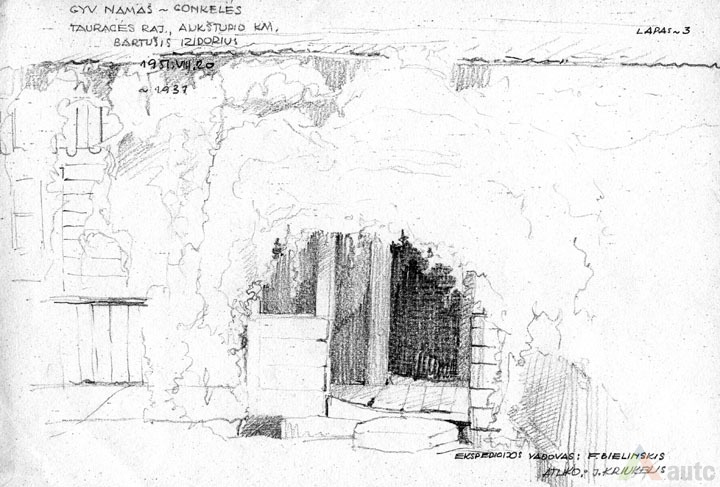 Sodyba nedidelė, priklausė neturtingam ūkininkui. Ją sudaro tik gyvenamasis namas (troba), tvartas su daržine, kurie telpa po vienu stogu, ir rūsio pastatėlis. Trūksta tokių tradicinių pastatų kaip svirnas, klojimas, daržinė. Erdvė tarp ūkinių pastatų formuoja „blogąjį“ (ūkinį) kiemą. Arčiausiai gyvenamojo namo įrengtas rūsys, kuriame laikyti šakniavaisiai, podėliui. Paprastai žemaitiškuose rūsiuose būdavo kelios patalpos (patalpa su akmenimis grįstomis duobėmis, skirta daržovėms, kamaraitė – namų apyvokos daiktams laikyti). Ties įėjimu būdavo pastogė (lėpis). Sodybos gyvenamasis namas nuo ūkinio kiemo aptvertas tvora, šalia namo tradiciškai užsodintas gėlių darželis, kuris irgi atitvertas tvorele. Gyvenamąjį namą supa didelis sodas. Į namą patenkama per prieangį, apsodintą vynuogėmis, kas gan reta Žemaitijos sodybų apželdinime. Namas statytas apie 1937 m. Tai dviejų galų žemaitiška troba su gan išplėtotu planu: name yra devynios patalpos. Kai kurios iš jų vadintos „stuba“ ar „stubike“  Suvalkijos gyvenamųjų namų įtaka. 1951 m. sodyba priklausė Izidoriui Bartušiui.