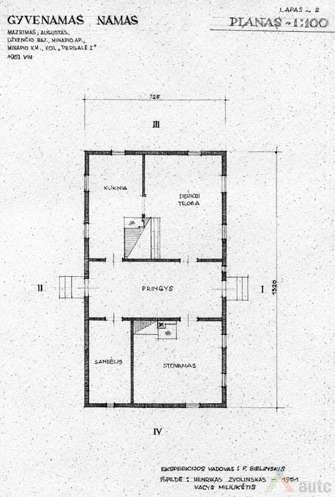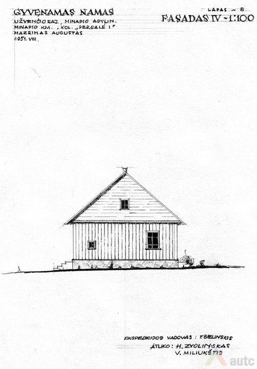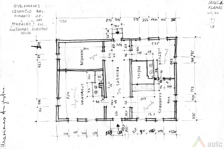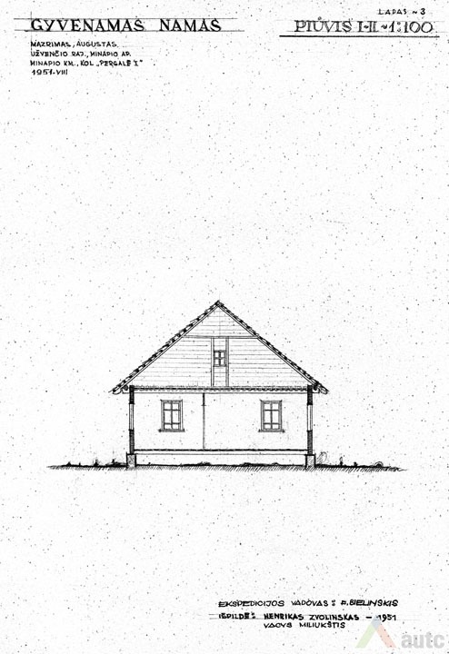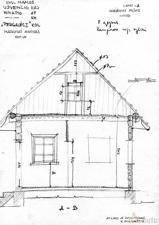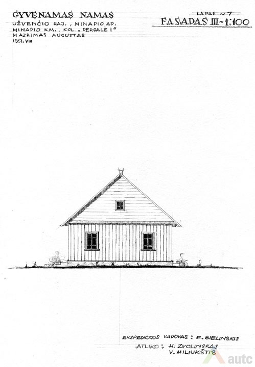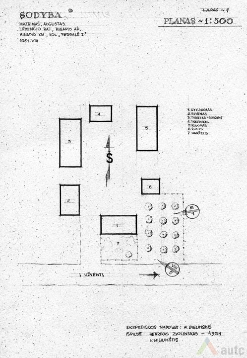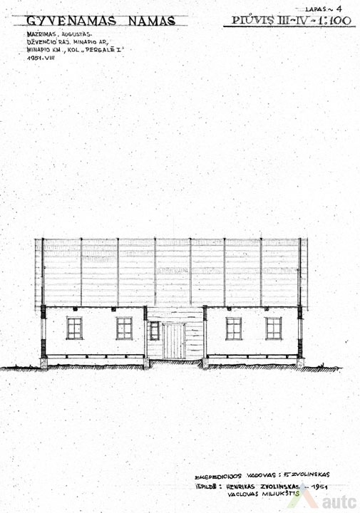 Gyvenamasis namas (troba), statytas 1927 m. Pastatas suręstas ant lauko akmenų ir betono skiedinio pamato. Sienos iš tašytų rąstų, sujungtų į lygias kertes. Sienos vertikaliai apkaltos lentelėmis. Namo stogas dvišlaitis, dengtas gontais, pastogės plačios. Skliautas horizontaliai apkaltas lentomis. Sienas ir skliautą jungia nedidelis stoginukas. Langai paprasti, šešiarūčiai, nepuošti. Durys vienvėrės, viensluoksnės. Tai tradicinis dviejų galų namas, tačiau artimas aukštaitiškai dviejų galų gryčiai, nes planas mažai išplėtotas, trūksta žemaitiškų „alkierių“. Pastatas šildomas dviem krosnimis. Pagrindinė patalpa – didžioji troba, kur vykdavo šeimos gyvenimas, darbai. Greta esančioje „kuknioje“ ruošdavo valgį. Priemenė (čia vadinta „pringys“) turi du įšėjimus į lauką (kiemą ir daržą). Priemenėje, kaip būdavo įprasta, lentinių grindų nėra, tik molio asla. Joje nėra ir lubų. Kitose patalpose lubos ir grindys medinės, sienos pagal to meto madą išklijuotos „popieriais“ (tapetais). Sodybos plane gyvenamasis namas tradiciškai stovi arčiausiai kelio, netoli svirno. Gėlių darželis sodintas namo pietinėje pusėje, prie gatvės, kad matytųsi vykstantiems pro šalį. Kiti sodybos pastatai sugrupuoti apie stačiakampio plano kiemo perimetrą. 1951 m. sodyba priklausė Augustui Mažrimui.