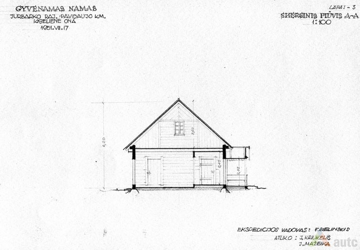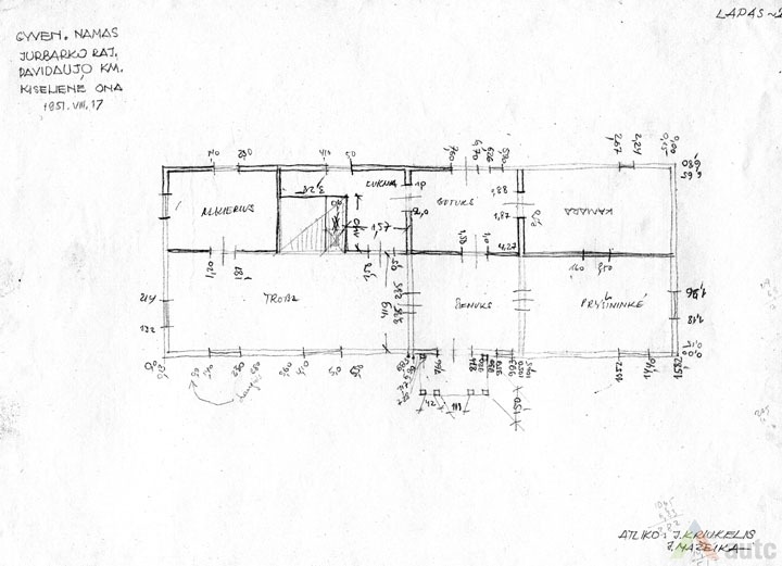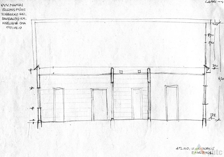 Tradicinis žemaitiškas gyvenamasis namas – troba – statytas apie 1900 m. Namas suręstas ant lauko akmenų pamatų, sienos tašytų rąstų, suleistų į lygias kertes. Namo stogas dvišlaitis, dengtas gontais. Skliautas puoštas derinant lentelių apkalą vertikaliai, horizontaliai ir įžambiai (įžambi apkala sudaro eglutės ornamentą), be to sukaltas puošnus stoginukas virš pastogės lango. Pagrindinis pastato įėjimas – prieangis („gonkos“) – atgręžtas į gatvę ir supamas sodo. Prieangio puošyba santūri, puošta pjaustytu ornamentu. Pagrindinės namo durys dvivėrės, įsprūdinės konstrukcijos. Namo planas būdingas tradicinei žemaitiškai trobai, joje daug patalpų (senuks, butuks, pryšininkė, kamara, troba, kuknia, alkierius). Žemaitiškose trobose būdavo nuo 5 iki 15 patalpų. Ši troba vidutinio dydžio. Namo viduryje yra priemenė su dviem išėjimais į lauką. Pertvara dalija priemenę į dvi dalis: geroji priemenė vadinama „senuks“, o ūkinė priemenė – „butuks“. Per gerąją priemenę patenkama į trobą ir „pryšininkę“. Pryšininkė – tradicinio žemaičių namo patalpa prie gerosios priemenės ir priešais trobą, kurioje dažniausiai gyvendavo karšinami seni tėvai. Pagrindinė patalpa – troba, kur vykdavo šeimos gyvenimas. Nuo trobos atitverta mažesnė patalpa – „alkierius“, skirtas svečiams apnakvindinti, nors dažniausiai naudotas kaip šeimininkų miegamasis. Greta trobos esančioje „kuknioje“ , kur yra duonkepė krosnis, ruošdavo valgį. Kamaroje buvo laikomi maisto produktai. 1951 m. namas priklausė Onos Kišelienės sodybai.
