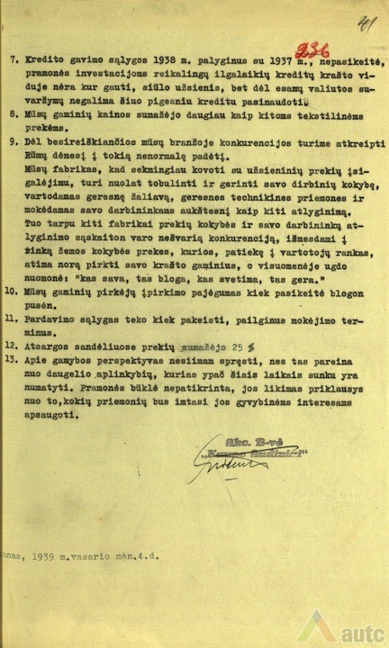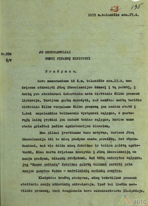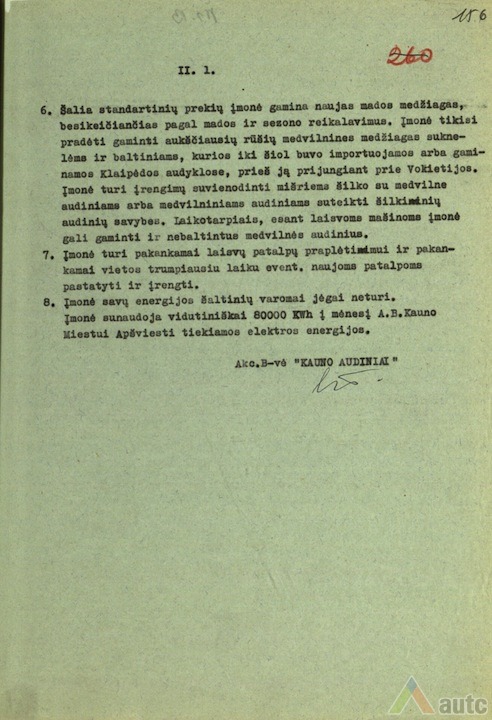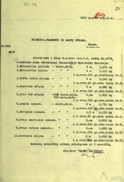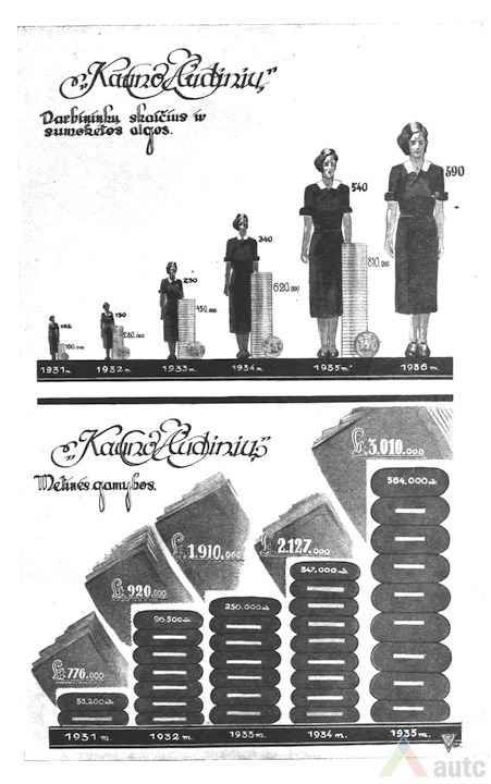 Plečiantis „Kauno audinių“ produkcijos apimtims 1931 m. jame dirbo 102 specialistai, išaudę 53 tūkstančius metrų vilnonių pusšilkinių ir 23 rūšių šilkinės medžiagos audinių, pavyzdžiui, Fai de lime, Crepe de lime, Gold marocaine ir t.t. Žaliavą fabrikas importavo net iš Italijos, Šveicarijos ir Vokietijos. Cecho teikiamą dėmesį produkcijos kokybei, įvairovei bei estetikai iliustruoja faktas, jog tais pačiais metais fabriko languose išeksponuotos net 2 audinių parodos su šilkinių medžiagų pavyzdžiais. Negana to, 1937-1938 m. fabriko sienoms papuošti dailės kūriniais (K. Šklėriaus „Neapol“ ir kt.) išleista 3632 litų[5]. Tikriausiai, tai įtakojo ir nenumaldomai auganti šio sektoriaus prekybos konkurencija. IV-ame XX a. dešimetyje „Kauno audinių“ fabrikas prarado gamybos monopoliją, 1935 m. įkurti dar du „Floros“ ir „Pluošto“ fabrikai, taip pat audę šilką[6].
