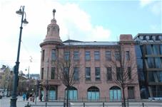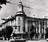 Triaukščio pastato, esančio Gedimino pr. ir J. Tumo – Vaižganto gatvių kampe, statybas datuojamas 1912 – 1913 metais, koordinavo architektas A. Parkovskis. Iš pradžių pastatas buvo skirtas pramonės ir prekybos atstovų susirinkimas, pirmame aukšte veikė prekybinės patalpos, todėl jam prigijo „pirklių klubo“ pavadinimas[1]. Tačiau 1933 metais pastatą nusipirko lietuvių sanitarinės pagalbos draugijos ligoninė, o antrosios sovietinės okupacijos metais jame įsikūrė Vilniaus miesto LDT vykdomasis komitetas. Šiam tikslui 1947 metais įvykdyta pastato rekonstrukcija (arch. V. Mikučianis), 1979 metais nudažyta pastato išorė, cokolis aptaisytas granito plokštėmis[2].