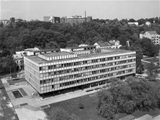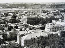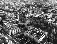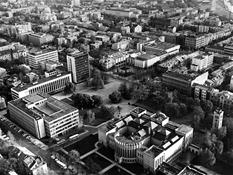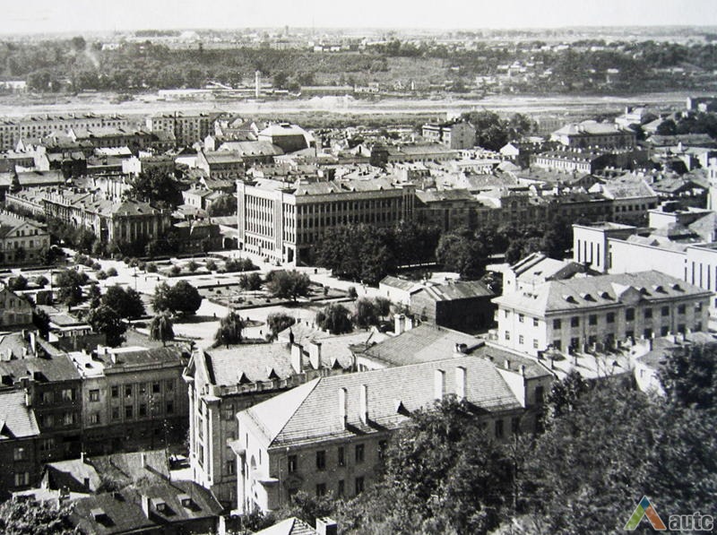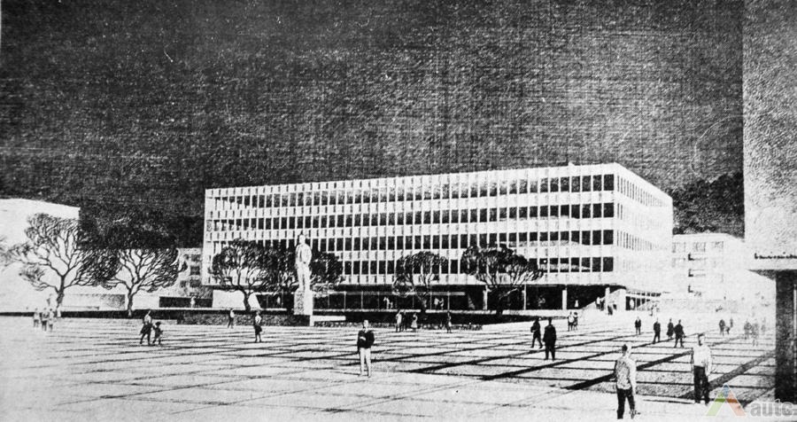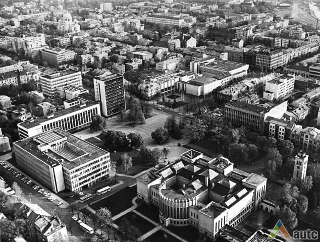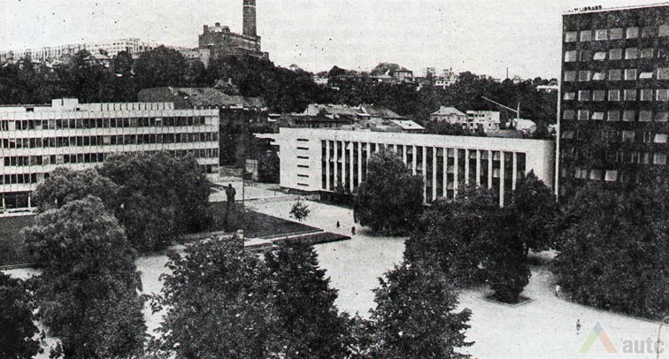 Vienybės aikštės užuomazgos radosi XIX a. viduryje, kai buvo sudarytas Kauno miesto planas. Carinės Rusijos laikotarpiu, o vėliau ir tarpukariu čia daugiausia buvo statomi administracinės ir komercinės paskirties objektai[1]. Sovietmečiu aikštės (tuomet J. Janonio) vaizdas pasikeitė, nes buvo intensyviai įgyvendinamas 1960 m. architektų V. Stausko ir S. Bartusevičiaus parengtas projektas. Čia telkėsi administracinės, kultūrinės ir švietimo paskirties pastatai. Pagrindiniai statybos darbai vyko nuo septinto dešimtmečio pradžios iki 1975 m., kai iškilo Pramoninės statybos projektavimo instituto rūmai (1965; toliau – PSPI), Politinio švietimo namai (1974; dab. VDU centriniai rūmai) ir Miestų statybos projektavimo instituto rūmai (1975; toliau – MSPI).
